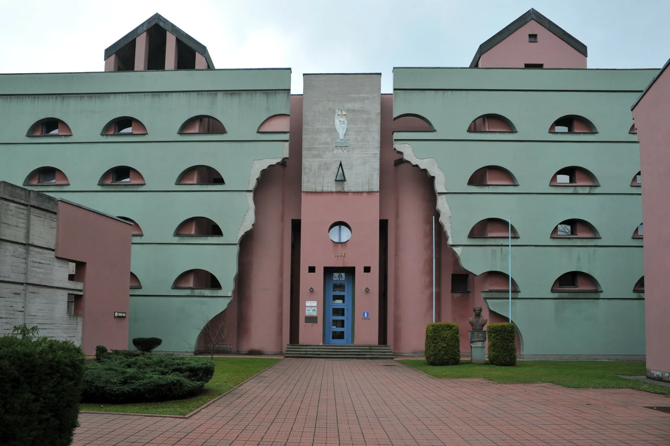 Wejście w kolorze różu, fasada w kolorze mięty, a do tego betonowe elementy. Strzelista wieża, do której przylega budowla z licznymi oknami w kształcie łuków. A dookoła niższe budynki z wieżami, przypominające mury. Budynek z daleka może przypominać twierdzę. Dariusz Kozłowski, w rozmowie z magazynem "Architektura-murator" w 2014 roku tak mówił o swoim projekcie: