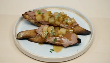 Mus z kurzych wątróbek na grzance z gruszkową konfiturą