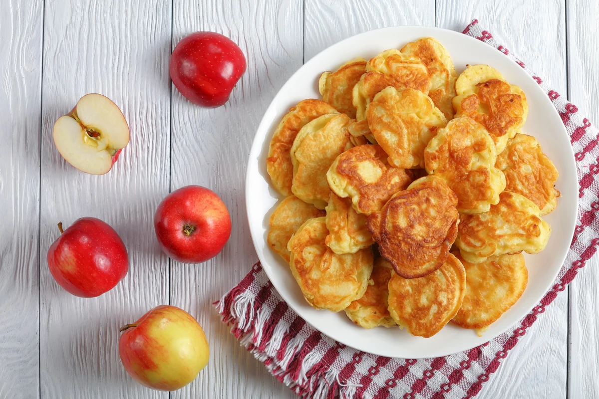 Jabłka obrać, zetrzeć i lekko odcisnąć. Mąkę, jajka, jogurt, proszek do pieczenia, sól i cukier wymieszać mikserem na gładką masę. Dodać starte jabłka i opcjonalnie doprawić cynamonem. Nakładać małymi porcjami na rozgrzany olej i smażyć z obu stron.