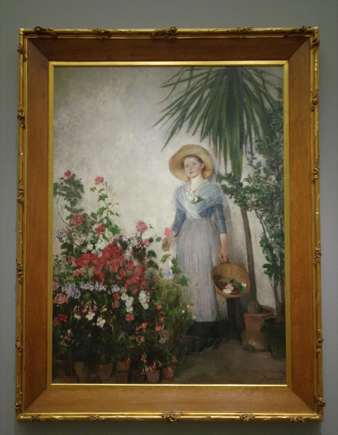 Spomiędzy kwitnących na fioletowo i różowo fuksji i pelargonii, palmy i krzewu róży chińskiej spogląda ona. Dziewczyna w słomkowym kapeluszu, szaroniebieskiej sukni i fartuchu w różowe paski patrzy wprost w oczy widza. W lewej dłoni trzyma wiklinowy kosz z kilkoma ściętymi kwiatami, a w prawej łodygę pelargonii. Tłem dla uchwyconej na pierwszym planie feerii barw jest szara ściana.