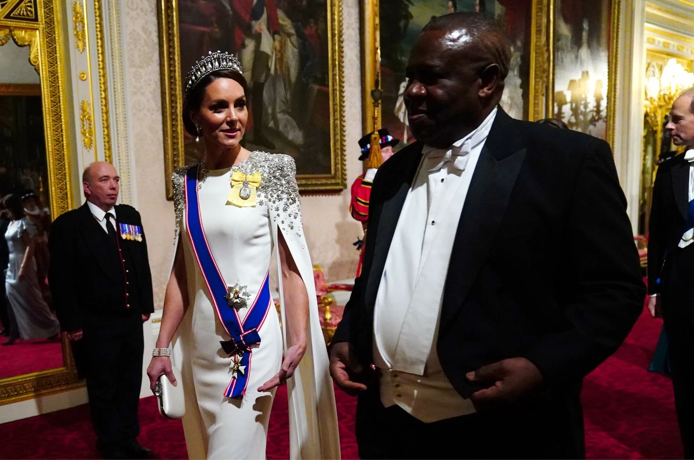 Rodzina królewska w niezwykle odświętnych strojach pojawili się na bankiecie, aby uroczyście przywitać Cyrila Ramaphosy. Nikogo nie zdziwił olśniewający wygląd żony księcia Williama, która jak zwykle prezentowała się niezwykle wytwornie, a dodatkami w formie historycznej biżuterii przykuła uwagę 160 uczestników i wszystkich zachwyciła. Księżna Kate, znana z doskonałego, wysublimowanego stylu pojawiła się na przyjęciu w białej, długiej do ziemi sukni Jenny Peckham, z błyszczącymi detalami na ramionach.