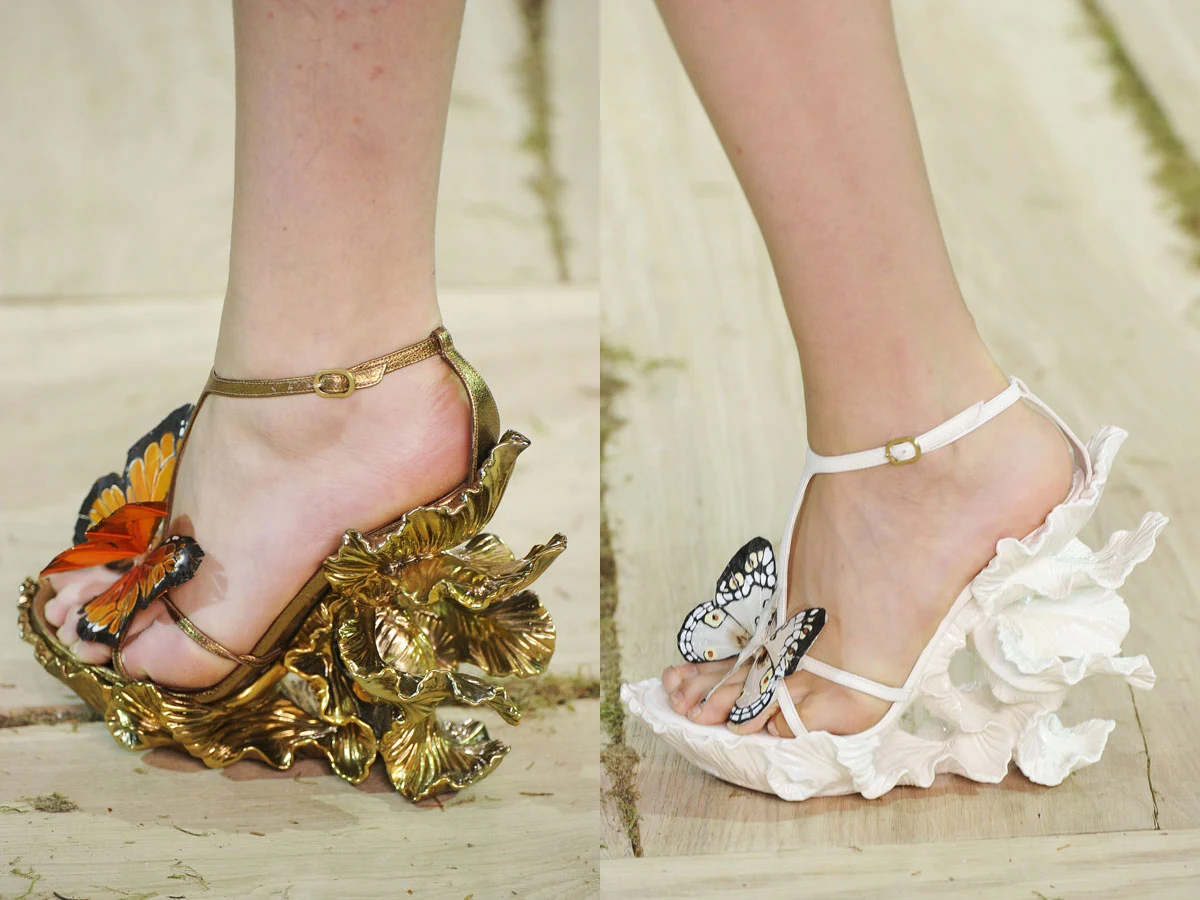 Wielbicielki romantycznych wzlotów tradycyjnie zaopatrują się u McQueena. Tym razem hebanowy obcas zdobi ornament z liści. Alternatywa? Kwiatowy kielich albo minibukiecik powiewający przy kostce. To pomysł na zmysłowy letni detal duetu D&G.