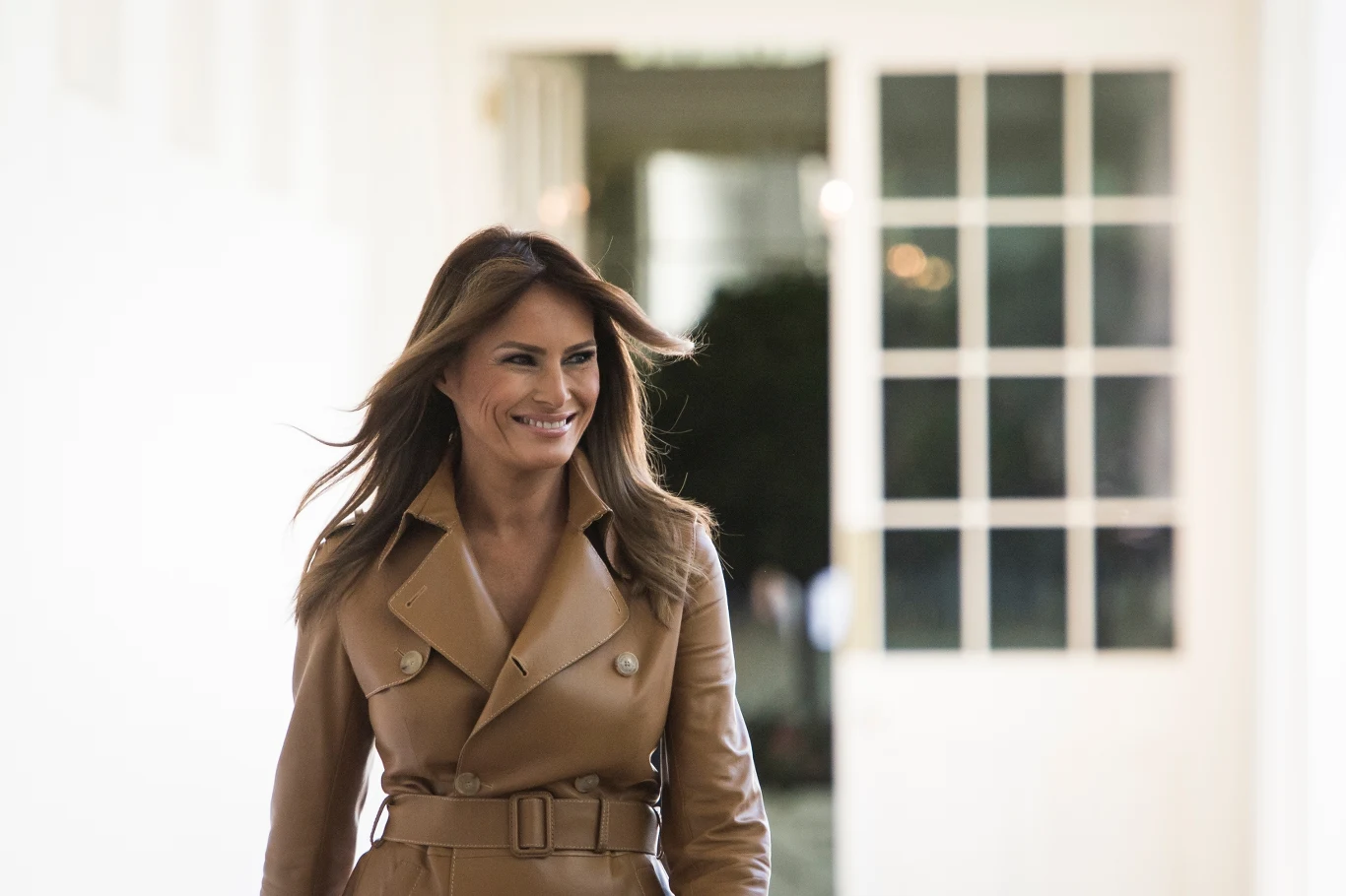 Pierwszą inspiracją jest stylizacja Melanii Trump utrzymana w jasnej, eleganckiej kolorystyce. Koszulową sukienkę w odcieniu ecru Melania Trump założyła podczas wizyty na Downing Street w Londynie w 2019 roku, a wciąż jest to doskonały i modny wybór. To doskonały przykład połączenia wygody i klasy. Fason sukienki nawiązuje delikatnie do stylu safari, jednak eleganckie dodatki sprawiają, że całość nabiera bardziej odświętnego charakteru.