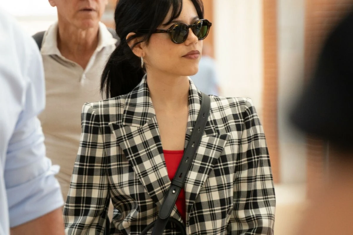 Na taki look postawiła Jenna Ortega, która obecnie promuje film "Sok z żuka 2". Podczas pobytu w Londynie aktorka zaprezentowała się w szarej marynarce w delikatną kratę, którą zestawiła z dżinsami i czarnymi loafersami.
